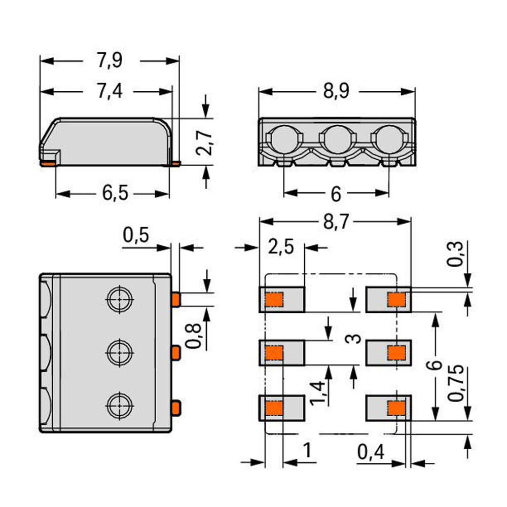 万可WAGO2059-303/998-403间距3mm三极SMD PCB贴片端子