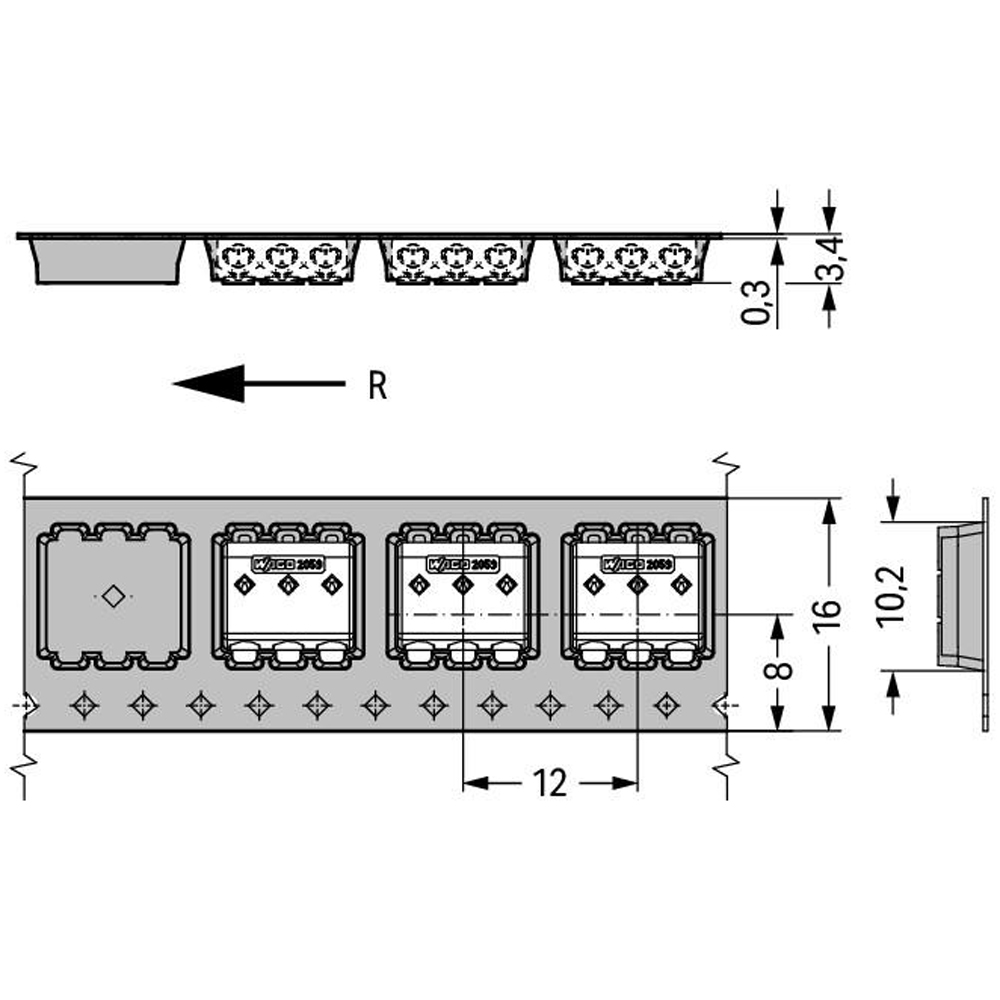 - WAGO2059-303/998-403,中文名称为SMD PCB接线端子,英文名称为SMD PCB Terminal Block,可描述为PCB接线端子及接插式连接器,1000只/卷;