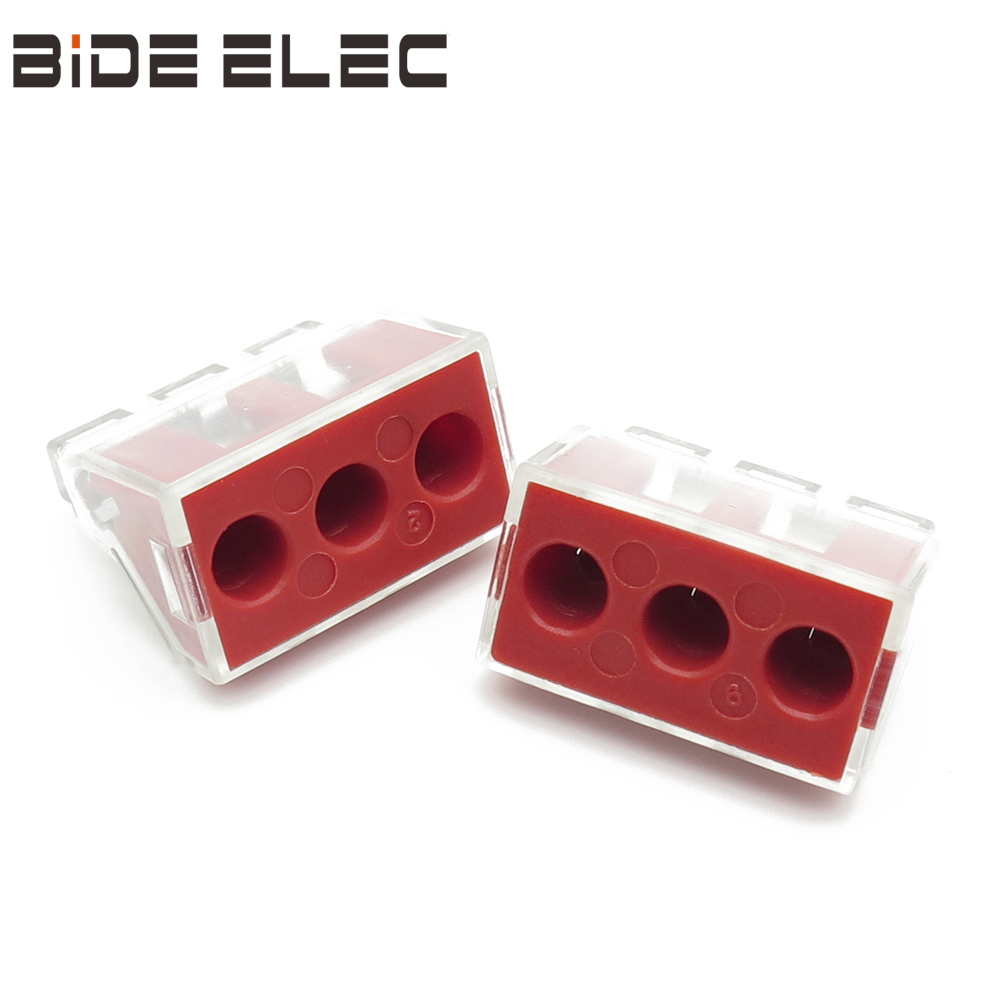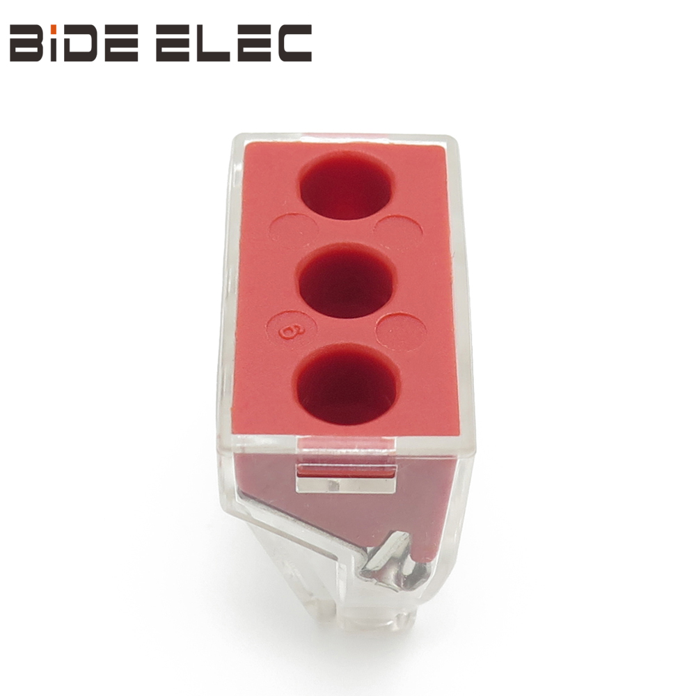 PCT-103D连接器有3个互通的孔,可连接单股/多勾绞合导线2.5-6.0mm2 ,替代传统鸡爪接线、镀锡和电胶布工艺,提高了美观度和接线效率,增加了安全性;